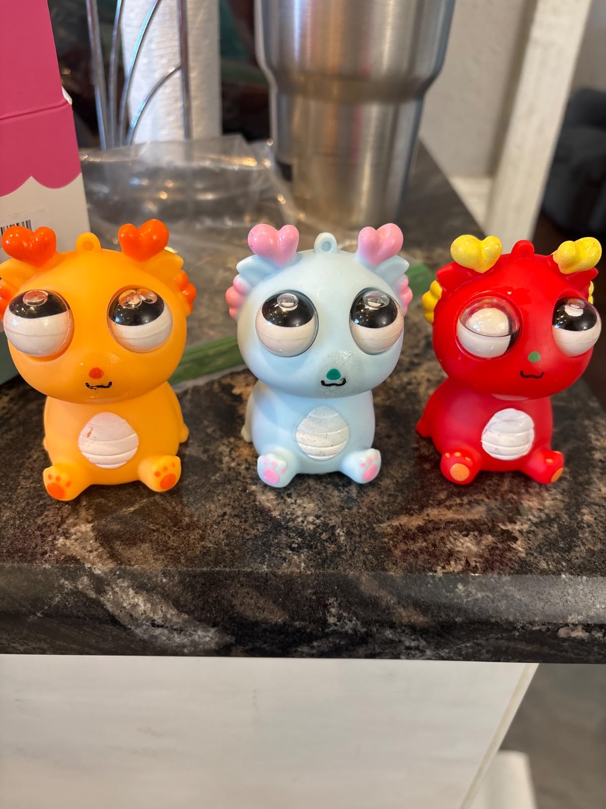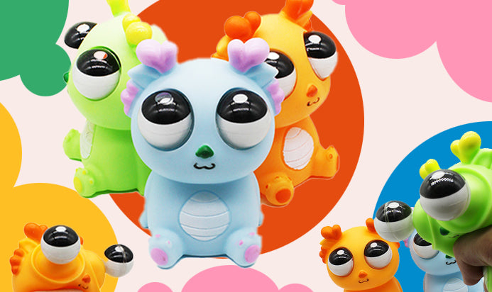 Llévate 5 dragones en diferentes colores que sacan los ojos de sus cuencas al apretarlos. Perfectos para jugar, coleccionar o regalar.